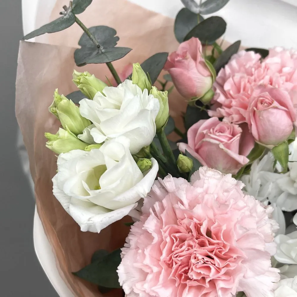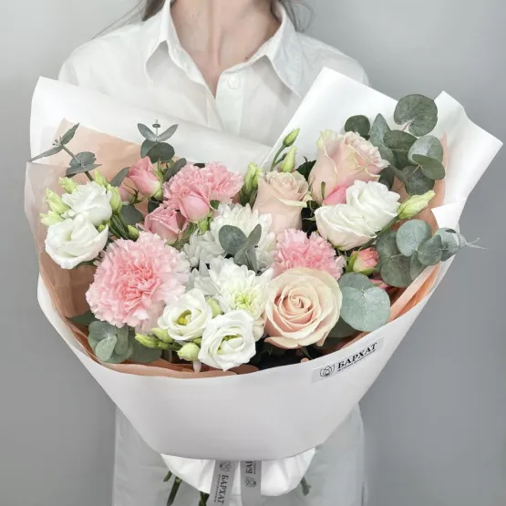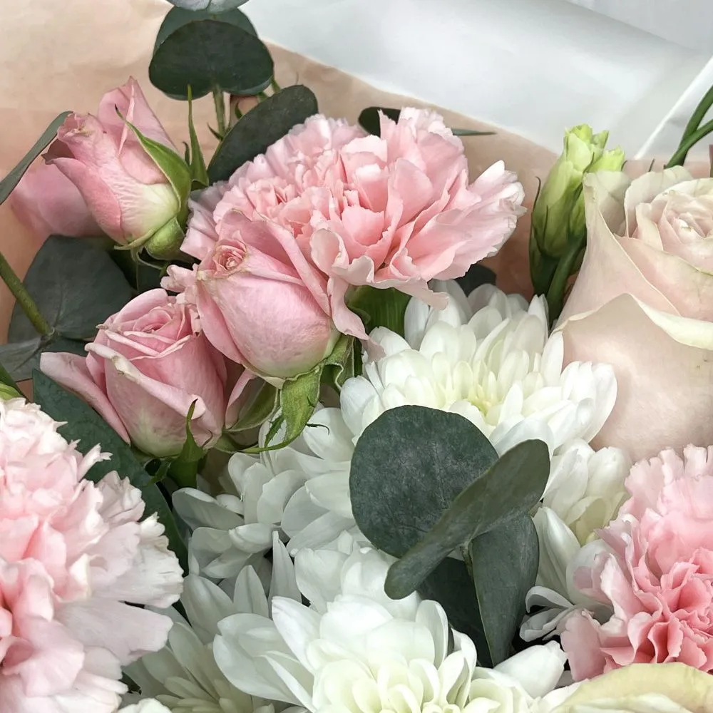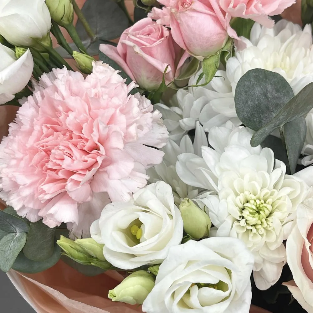 Роза одноголовая, Роза кустовая, Хризантема кустовая, Эустома, Гвоздика, Эвкалипт