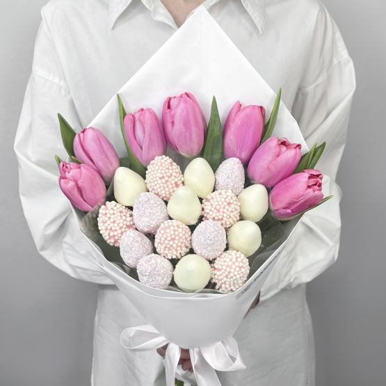 Состав: клубника в шоколаде 220 г, тюльпан 7 шт. Букет из свежей клубники Альбион в фирменном шоколаде и живых цветов. Клубника держится на каркасе из шпажек. Ягода отделена от цветов прозрачной пленкой. Готовый букет упаковывается в прозрачную слюду. Фирменная открытка-инструкция по хранению — в подарок. Этот букет — идеальный способ выразить чувства: ко дню рождения, годовщине, 8 Марта, 14 Февраля, Дню матери, Дню учителя, Дню бабушки и дедушки или просто в знак внимания и заботы. Букет из клубники и цветов — съедобный букет — отличный подарок бабушке, маме, любимой женщине, жене, подруге, сестре, друзьям и коллеге.