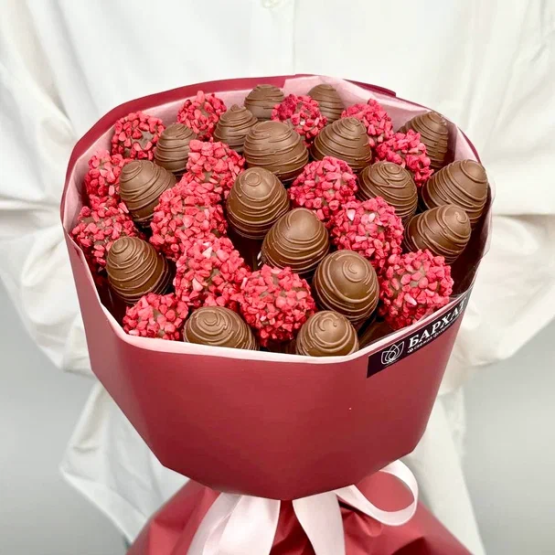 Состав: клубника в шоколаде 300 г. Букет из свежей клубники в бельгийском шоколаде. Клубника держится на каркасе из шпажек. Готовый букет упаковывается в прозрачную слюду. Фирменная открытка-инструкция по хранению — в подарок. Этот букет — идеальный способ выразить чувства: ко дню рождения, годовщине, 8 Марта, 14 Февраля, Дню матери, Дню учителя, Дню бабушки и дедушки или просто в знак внимания и заботы. Букет из клубники — съедобный букет — отличный подарок бабушке, маме, любимой женщине, жене, подруге, сестре, друзьям и коллеге.