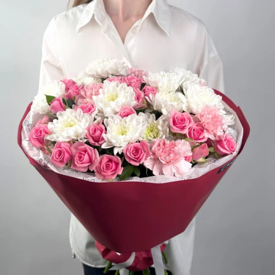 Состав: роза кустовая 5 шт., гвоздика 6 шт., хризантема кустовая 3 шт. Букет из свежих цветов — идеальный способ выразить чувства: ко дню рождения, годовщине, 8 Марта, 14 Февраля, Дню матери, Дню учителя, Дню бабушки и дедушки или просто в знак внимания и заботы. Фирменная открытка-инструкция по хранению — в подарок. Цветочный букет — отличный подарок бабушке, маме, любимой женщине, жене, подруге, сестре, друзьям и коллеге.