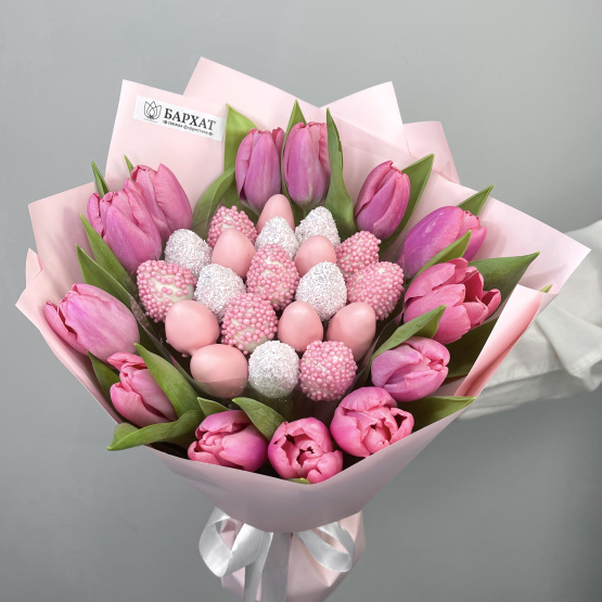 Состав: клубника в шоколаде 220 г, тюльпан 13 шт. Букет из свежей клубники Альбион в фирменном шоколаде и живых цветов. Клубника держится на каркасе из шпажек. Ягода отделена от цветов прозрачной пленкой. Готовый букет упаковывается в прозрачную слюду. Фирменная открытка-инструкция по хранению — в подарок. Этот букет — идеальный способ выразить чувства: ко дню рождения, годовщине, 8 Марта, 14 Февраля, Дню матери, Дню учителя, Дню бабушки и дедушки или просто в знак внимания и заботы. Букет из клубники и цветов — съедобный букет — отличный подарок бабушке, маме, любимой женщине, жене, подруге, сестре, друзьям и коллеге.