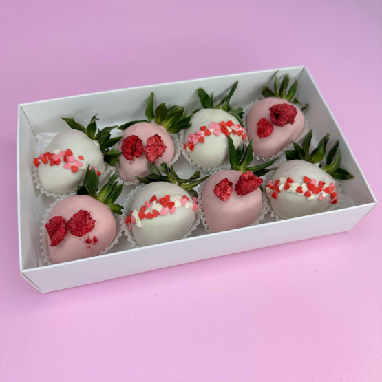 Состав: клубника в шоколаде 8 шт.  Коробочка свежей клубники в фирменном шоколаде — воплощение нежности и любви. В её основе — сочные ягоды отборной клубники Альбион, каждая из которых вручную окутана бархатистым шоколадом и украшена изящными посыпками. Это безупречный подарок для самого романтичного дня в году — 14 февраля (Дня Святого Валентина). Такой знак внимания станет прекрасным дополнением к букету, создав идеальную гармонию роскоши и чувственности. А в качестве самостоятельного презента это сильное и запоминающееся признание, которое останется в сердце надолго. Идеальная валентинка для самой особенной женщины: любимой, жены, подруги, мамы или дочери. Не забывайте и о мужчинах, ведь им тоже приятно получить такой подарок: любимому мужчине, парню, другу, мужу. Дарите вкус, перед которым невозможно устоять.