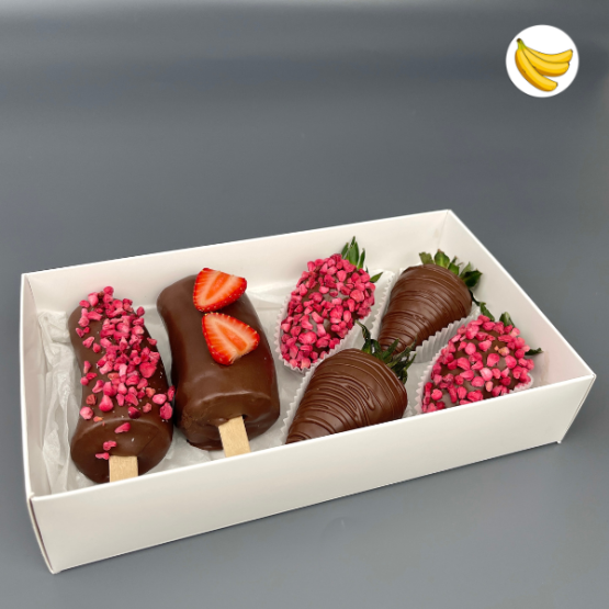 Бананы в шоколаде, Клубника в шоколаде, Клубника без шоколада, Посыпка: Сублимированная малина