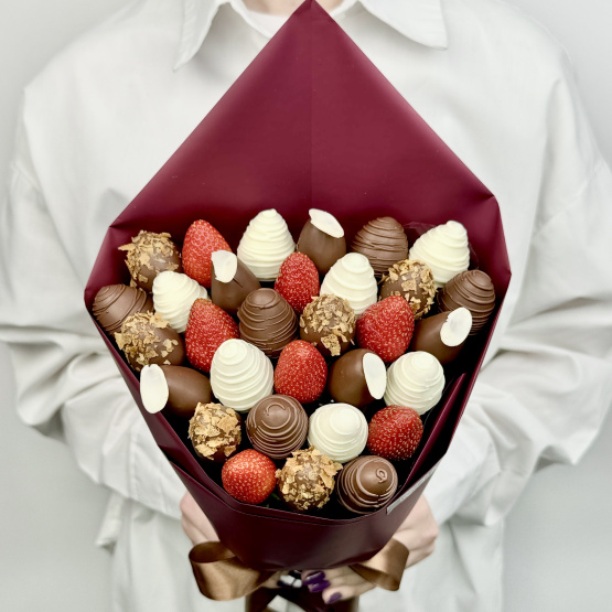 *Обратите внимание: изображение в карточке товара носит иллюстративный характер — реальный букет может незначительно отличаться от фото (например, по размеру клубники, форме и сборке). Точные размеры букета указаны в карточке товара.