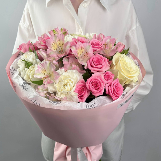 Гвоздика белая, Роза одноголовая белая , Роза кустовая розовая, Альстромерия розовая