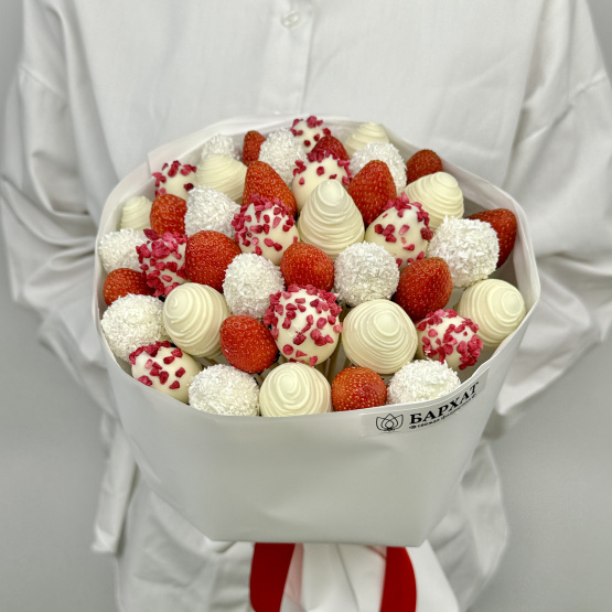*Обратите внимание: изображение в карточке товара носит иллюстративный характер — реальный букет может незначительно отличаться от фото (например, по размеру клубники, форме и сборке). Точные размеры букета указаны в карточке товара.